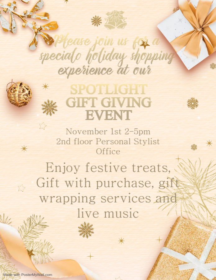 Kick off the holiday season in style at Macy’s Women's! Join us for a special holiday shopping experience at the Spotlight Gift Giving Event, featuring festive treats, live music, and exclusive in-store perks. Enjoy complimentary gift wrapping services, a gift with purchase, and personalized shopping assistance on Level 2 to help you find the perfect presents for everyone on your list.