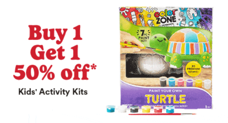 Hurry in and save! Shop in store and enjoy buy 1 get 1 50% off on kids' activity kits.