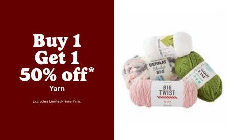 Excludes Limited Time Yarn. Buy one item at regular price & get the second of equal or lesser value 50% off. Excludes clearance.