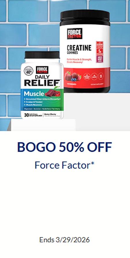 Shop in store and buy one, get one 50% off on Force Factor products for a limited time.