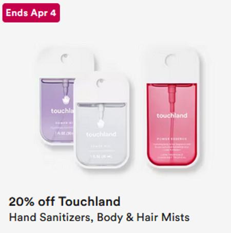 20% off Touchland Hand Sanitizers, Body and Hair Mists